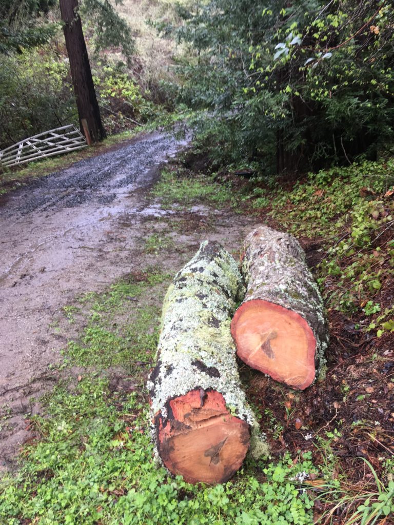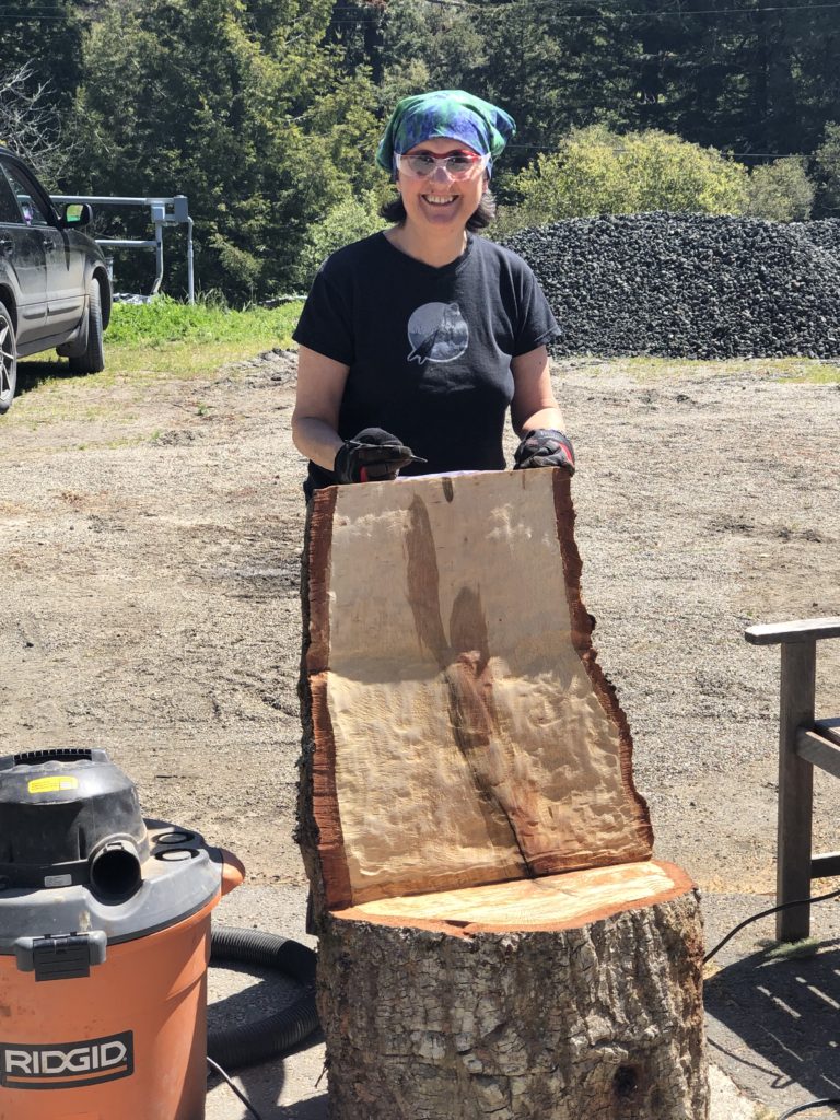 My first week at the residency, heavy rains toppled an old oak elsewhere on the property. Workers cut it up to clear the trail. I had my materials. Djerassi staffer Wade Watkins worked chainsaw magic, shaping one of the logs into the beginnings of a chair. What a log it was — with beautiful heartwood and moss-covered bark.