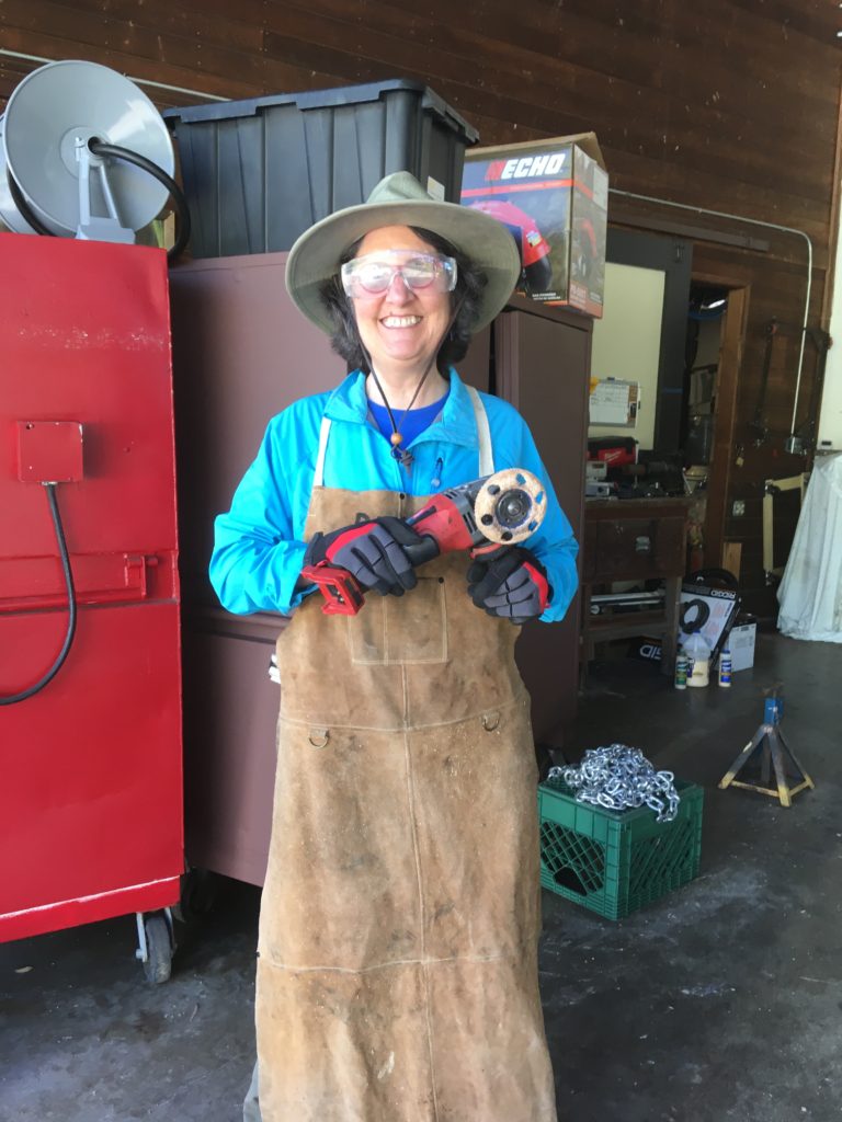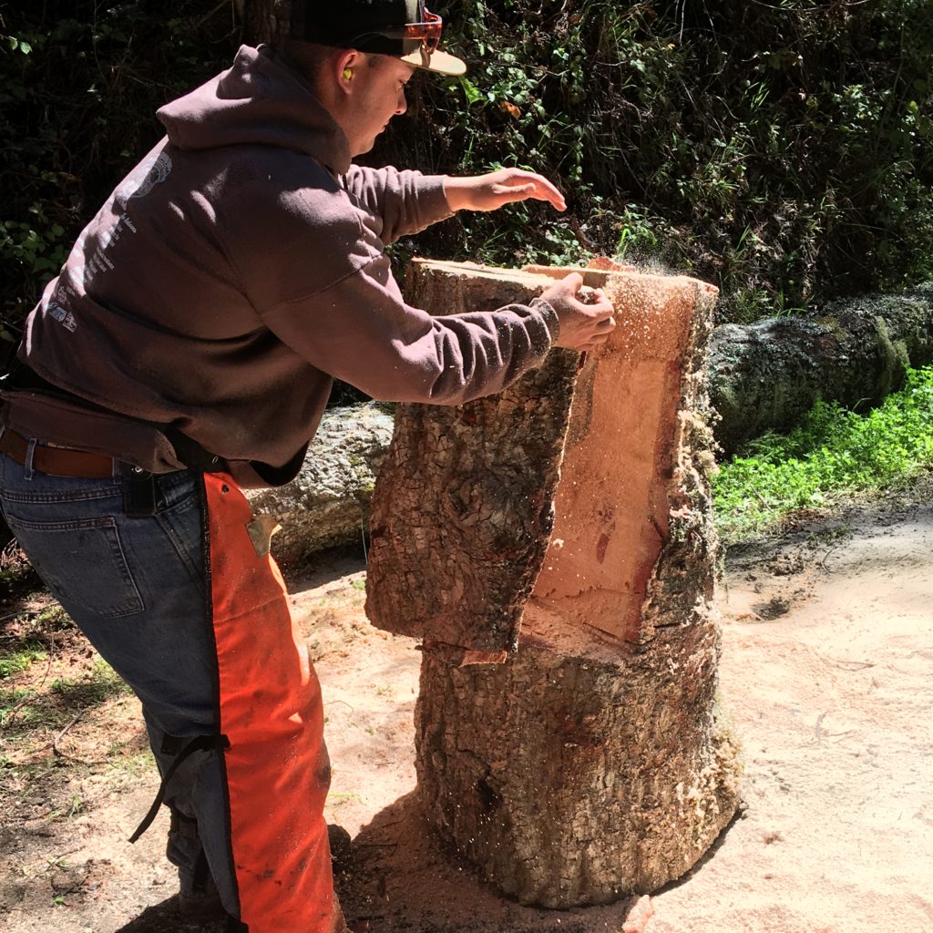 My turn to play with power tools — starting with a super gnarly sander that gouged chunks of wood to eliminate the chainsaw marks and slant the back into a comfortable shape. Then a lighter buffing to reduce rougher spots.