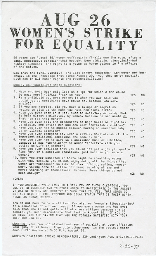 Author and activist Betty Friedan surprised her feminist allies in 1970 by calling for a Women’s Strike for Equality, urging women to pour into the streets on August 26. And they did all over the United States, generating the largest women’s public protest up to then and perhaps my favorite slogan of all time: “Don’t iron while the strike is hot!” The federal government in 1971 declared August 26 Women’s Equality Day.
